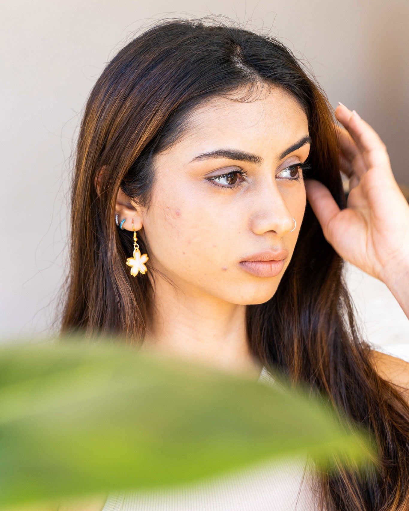 Pink flowers settle on collarbones and wrists,